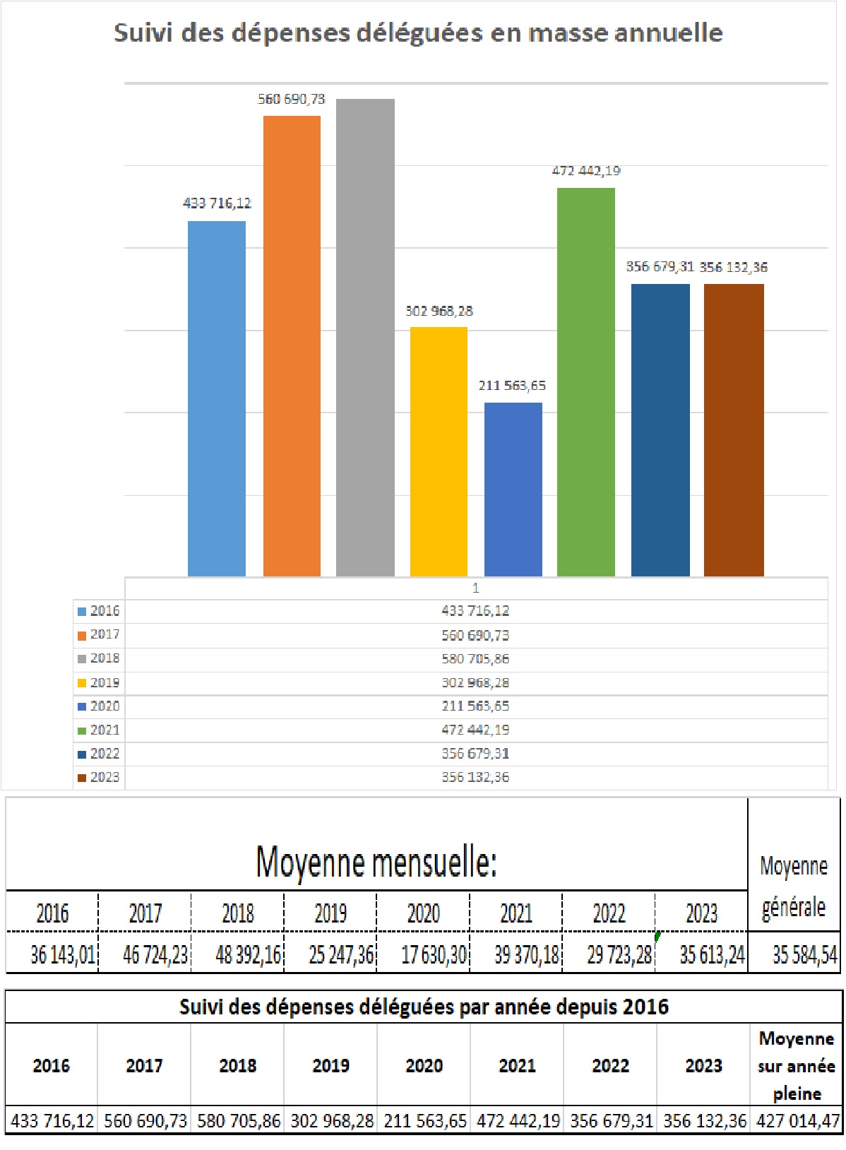 – Point de l’ordre du jour: Décisions du Maire prises dans le cadre de ses délégations (Article L.2122-22 du code général des collectivités territoriales). Le niveau de dépenses déléguées se monte à 356 132,36€ pour cette années 2023, arrêté au 30 Novembre. Il reste, à ce stade, inférieur à la moyenne annuelle depuis 2016. On peut discuter sur les priorités et les choix fait mais le niveau reste dans une moyenne supportable. Depuis le Conseil du 19 Octobre, elles s’élèvent à 19 944,25€, dont le détail suit. Depuis le début de l’année en voici le …