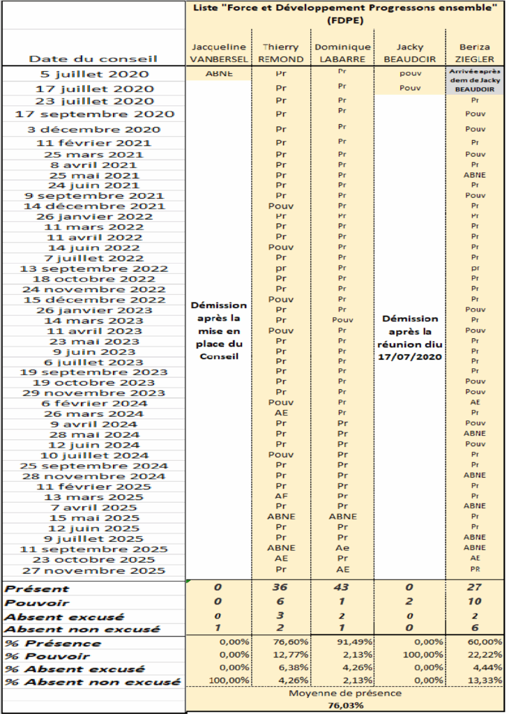 Nos échos du Conseil (27/11/25): l’appel sans vidéo! 27 novembre 2025 Point de l’ordre du jour: l’appel des présents Pour des raisons techniques tenant à l’incapacité de la majorité d’avoir une mise en vidéo fiable vous n’aurez pas le droit aux images de l’appel des présents. Alors qu’il y a une dizaine de personnes dans la salle, Didier FALAMPIN est désigné fait l’appel, il y alors 19 Conseillers qui siègent, Emilie VERGALI de la liste majoritaire a donné pouvoir à Adrien VERGALI qui arrivera en retard; Sabrina MASCOMERE de la liste « Un Nouvel Avenir » a donné pouvoir à Fabrice DORE et Dominique LABARRE de la liste …