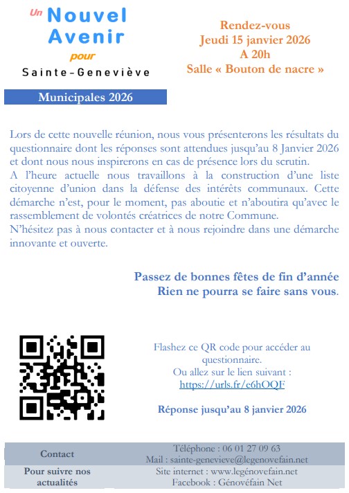 • Un Nouvel Avenir pour Sainte-Geneviève vous propose une rencontre, le Vendredi 5 Décembre 2025, 20h3024 novembre 2025