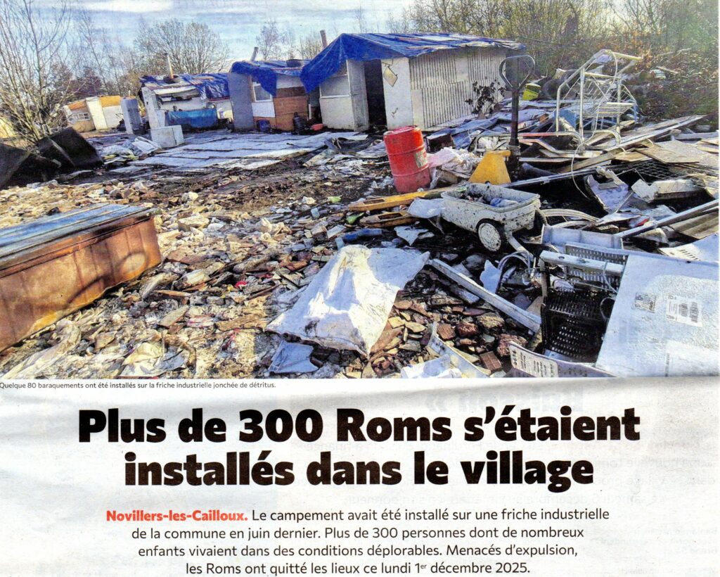 Dans le Courrier picard (5/12/25): évoque l’évacuation des roms installés dans la friche METALFORM sur Novillers-les-Cailloux en limite de notre Commune!