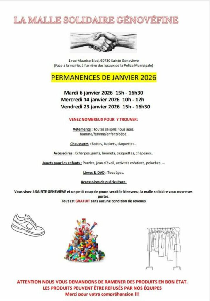 Les permanences de la Malle solidaire pour Janvier 2026…. – Le Génovéfain Net