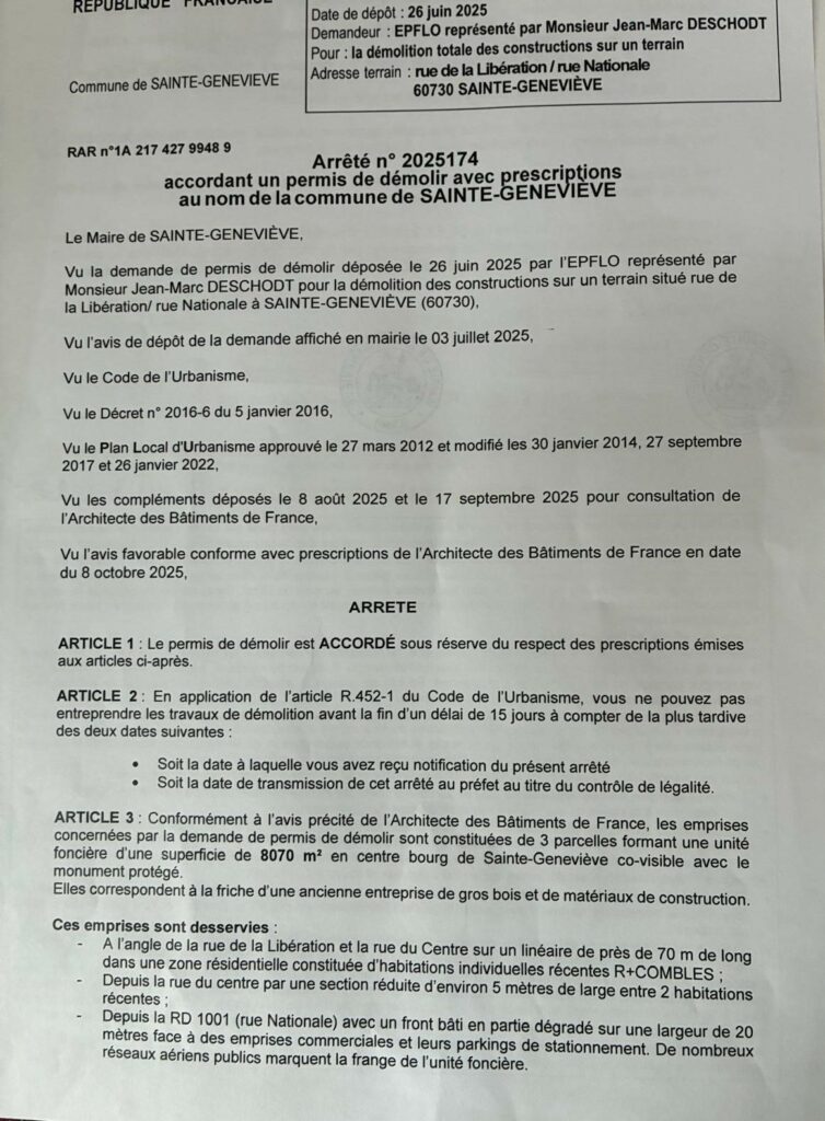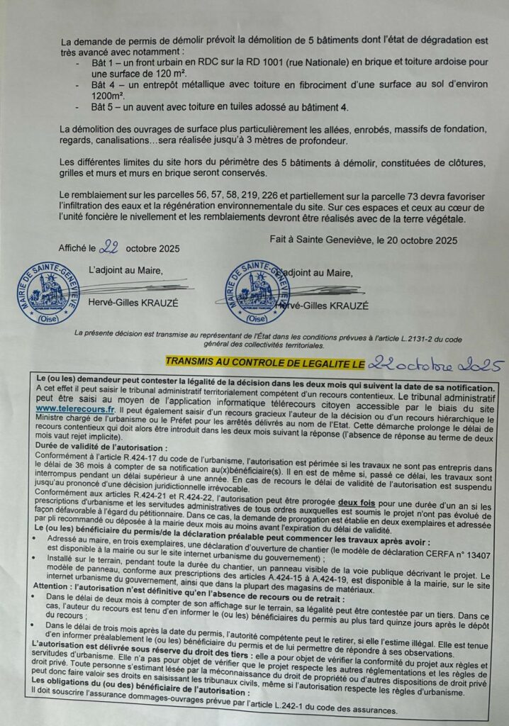Le permis de démolir les bâtiments de l’espace DENIS est affiché en Mairie, c’est un document public, nous pensons que sa diffusion la plus large est souhaitable. Il fait état de la destruction des deux maisons qui sont au 113 et 115 Route Nationale, de l’entrepôt métallique et d’un autre bâtiment avec auvent… Bonne lecture