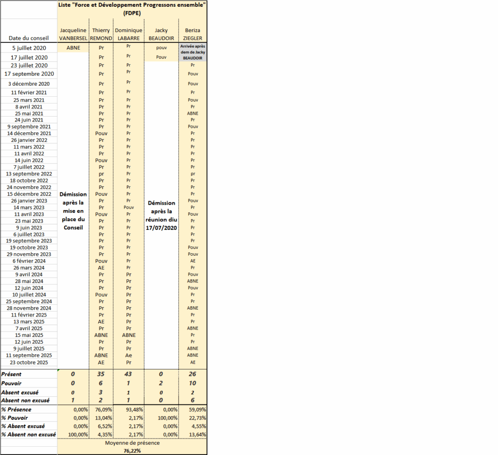 Les présences pour le groupe « Force Développement – Progressons Ensemble »