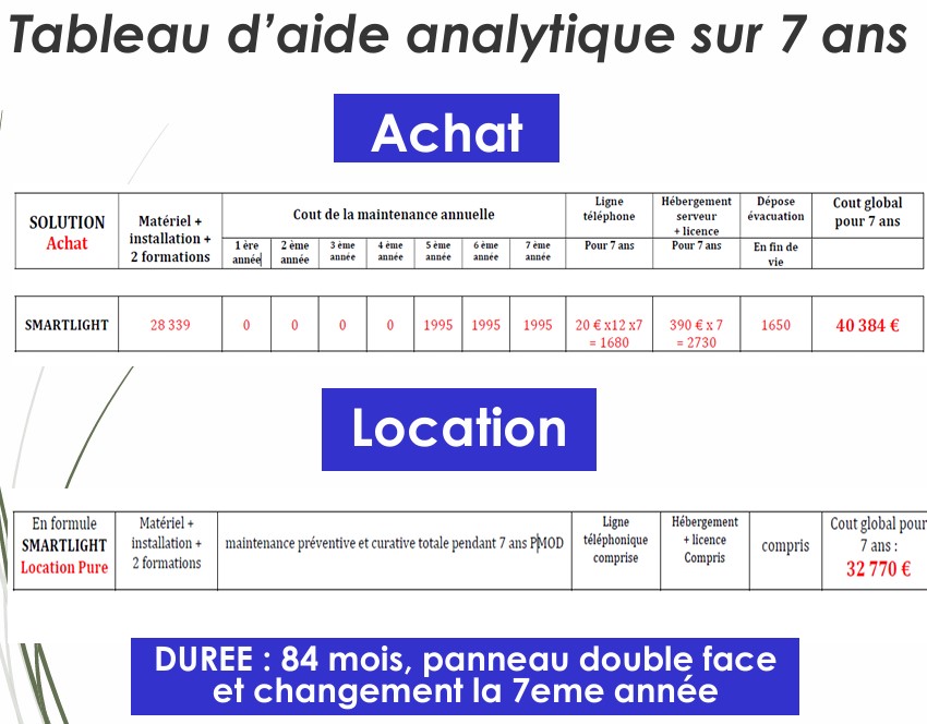 la location ou l’achat. Après présentation des avantages et des inconvénients lors du dernier Conseil Municipal, la location est plus intéressante pour les raisons suivantes : – Maintenance préventive et curative à la charge du propriétaire. – Changement intégrale tous les 7 ans. – Ligne téléphonique incluse. – Hébergement et licence compris pour l’utilisation du logiciel. – Installation et formation pendant la durée du contrat. – Dépose et évacuation en fin de vie. Pour toutes ces raisons, il est proposé au Conseil Municipal le changement du panneau lumineux