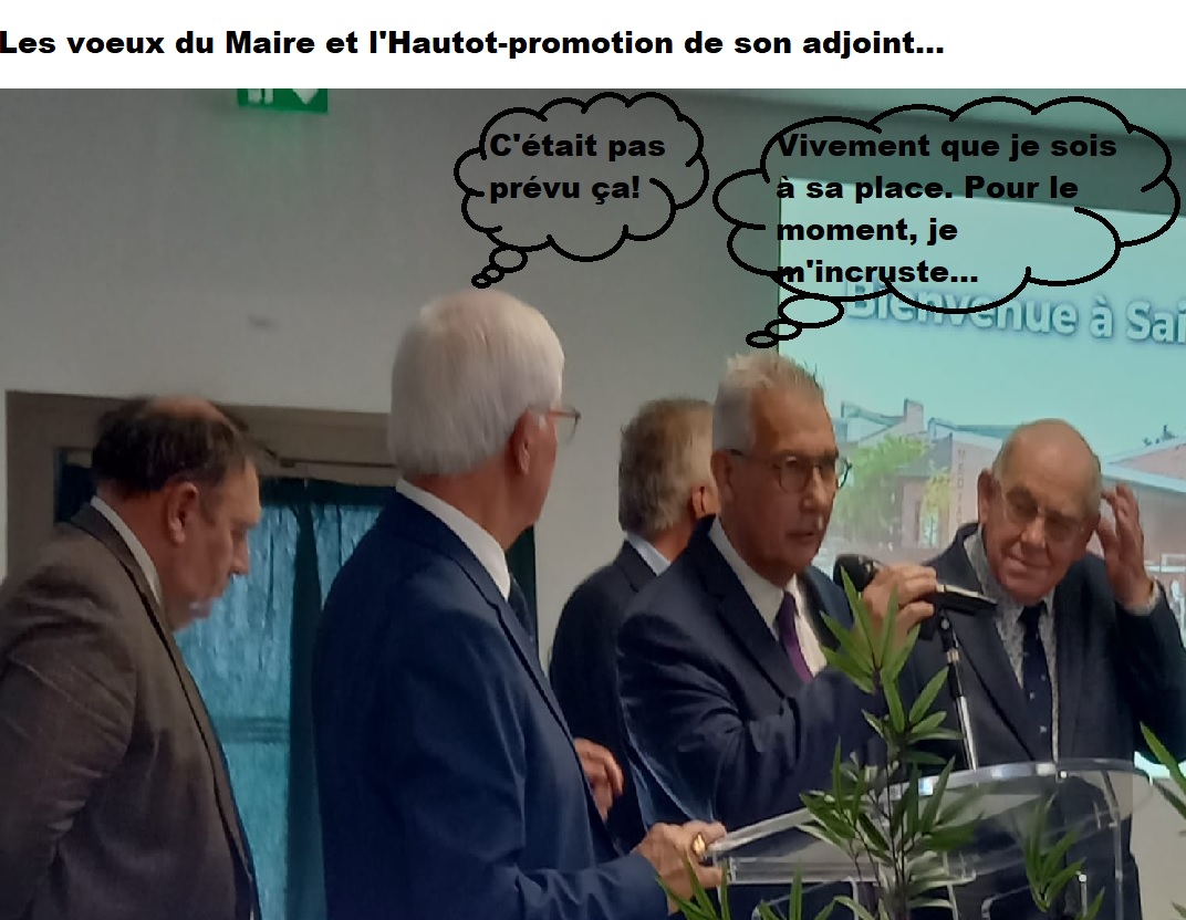 Alors que la séance des voeux municipaux se passe tout à fait normalement, que le Maire a fait une intervention tout à fait correcte, les personnalités, Pierre DESLIENS, Président de la Thelloise (à droite sur la photo), Philippe BALLARD, Député de la Circonscription (derrière le 1er adjoint) et Benoît BIBERON, Conseiller départemental du Canton (à gauche sur la photo) ont fait leur discours (dans cet ordre), le Maire invite au pot de l’amitié, le 1er adjoint monte sur scène, allant ainsi à l’encontre de tous les protocoles, et après s’être saisi du micro, clame quelques …