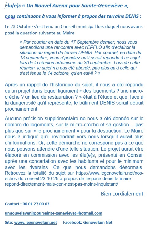 A lire sur ce sujet: · Nos échos du Conseil (23/10/25): à propos de l’espace DENIS, le Maire répond directement mais c’en n’est pas moins inquiétant… Point de l’ordre du jour: b) Par courrier en date du 17 Septembre dernier, nous vous demandions une rencontre avec l’EPFLO afin d’éclaircir la situation au regard du terrain DENIS. Par courriel, … Continuer la lecture →
